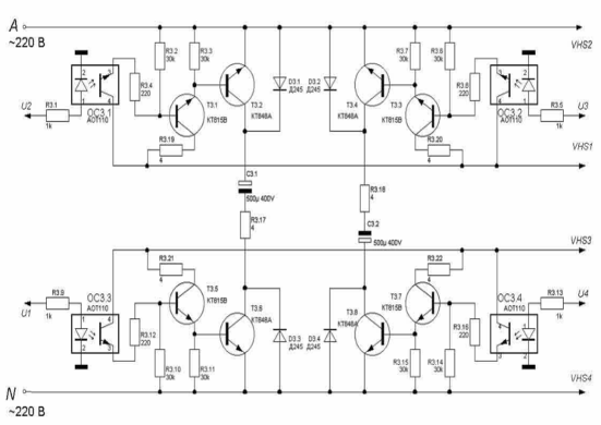 Рекуператор (рис.9) представляет собой два одинаковых канала, каждый из которых обеспечивает подключение к электрической сети отдельного накопительного конденсатора С3.1 или С3.2 Канал управления конденсатором С3.1 состоит из мощных транзисторов Т3.2, Т3.6, выпрямительных диодов D3.1, D3.3, усилительных каскадов на транзисторах Т3.1, ТЗ. З и узлов гальванической развязки от электросети на оптронах ОС3.1, ОСЗ.З. Канал управления конденсатором С3.2 построен аналогично. За счет алгоритма работы системы управления обеспечивается работа конденсатора С3.1 на положительной полуволне сетевого напряжения, а С3.2 - на отрицательной.