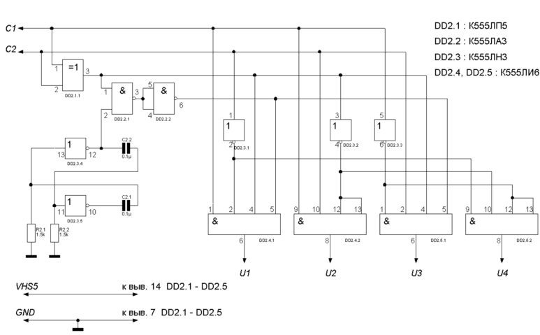 Микросхемы могут применяться любые: 155, 133, 156 и других серий. Не рекомендуется применение микросхем на основе МОП - структур, так как они более подвержены влиянию наводок от работы мощных ключевых каскадов.