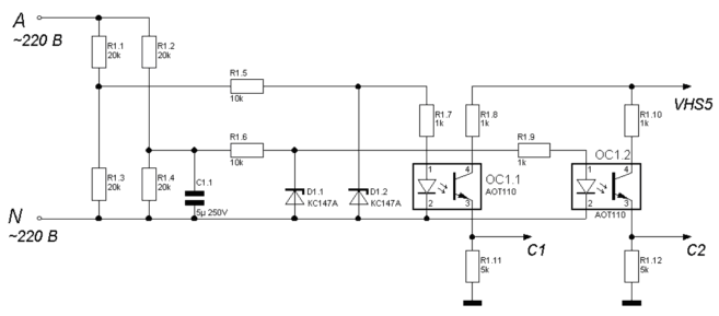 Сигнал, соответствующий напряжению сети, снимается с резистивного делителя Е.1.1, Е.1.3, ограничивается до уровня 5 В с помощью резистора ЕЛ.5 и стабилитрона D1.2, затем через узел гальванической развязки на оптроне ОС 1.1 подается на другие модули. Аналогично формируется сигнал, соответствующий интегралу напряжения сети. Процесс интегрирования обеспечивается процессами заряда и разряда конденсатора С1.1
