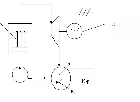 Турбина 3 предназначена для преобразования энергии пара в механическую энергию вращения ротора электрического генератора. Генератор 4 вырабатывает электрическую энергию, которая поступает на повышающий трансформатор Т, где преобразуется до необходимых величин для дальнейшей передачи в линии электропередач. Часть энергии также передаётся на ТСН – понижающий трансформатор собственных нужд.