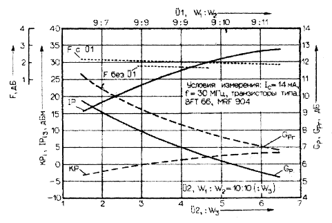 С учетом требований технического задания определим ток коллектора Iк VТ так, чтобы коэффициент шума не превышал 2 дБ. Для этого по графикам рис.2 находим для относительного числа витков трансформатора обратной связи n1=5 оптимальный по многосигнальному динамическому диапазону режим работы транзистора: Iк= 10 mА, Кш=2 дБ.