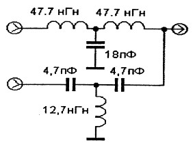 Схема разветвителя выполняется на реактивных элементах в виде взаимно дополняющих фильтров ФНЧ и ФВЧ, имеющую граничную частоту в полосе 250-470 МГц. Неэффективность применения разветвителя в качестве устройств подобного типа обусловлена затуханием сигнала в нем, составляющим более 3 дБ. При использовании фильтров затухание в полосе минимально, зависит от типа фильтра, и его порядка и обычно не превышает 1дБ. В качестве исходных данных при проектировании разветвителя МВ-ДМВ принимаем: