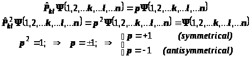 Действуя на волновую функцию, оператор перестановки исторгает из неё собственное значение, но при этом умудряется её самоё не изменять. Перед нею просто возникает некоторое число - собственное значение этого оператора. Если же оператор перестановки применить к волновой функции коллектива повторно, то обе переставляемые частицы возвращаются на исходные позиции – в исходные состояния, и волновая функция обязана обратиться вновь сама в себя. Система возвращается в исходную ситуацию, и поэтому собственное значение квадрата оператора перестановки равно единице. Получаем равенства: