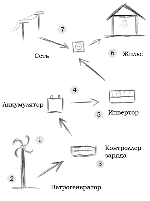 Ветер раскручивает ротор. Выработанное электричество подаётся через контроллер на аккумуляторы. Инвертор преобразует напряжение на контактах аккумулятора в пригодное для использования