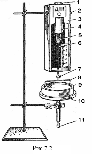 Динамометр типу ДПН (рис. 2) складається з корпуса 3, всередині якого розташована пружина 5, що закінчується відрізком прямого дроту з гачком 7. Гачок призначений для з’єднання петлі 8 з пружиною динамометра. Для відліку показів по шкалі динамометра на дроті закріплена стрілка 6. Досліджувану рідину наливають в скляну чашку 9. Для вимірювання коефіцієнту поверхневого натягу дротяну петлю повністю занурюють в рідину, а потім повільно витягують з неї. При цьому на петлі утворюється плівка. Коли сила пружності пружини динамометра стане рівна силі поверхневого натягу F, плівка розривається.
