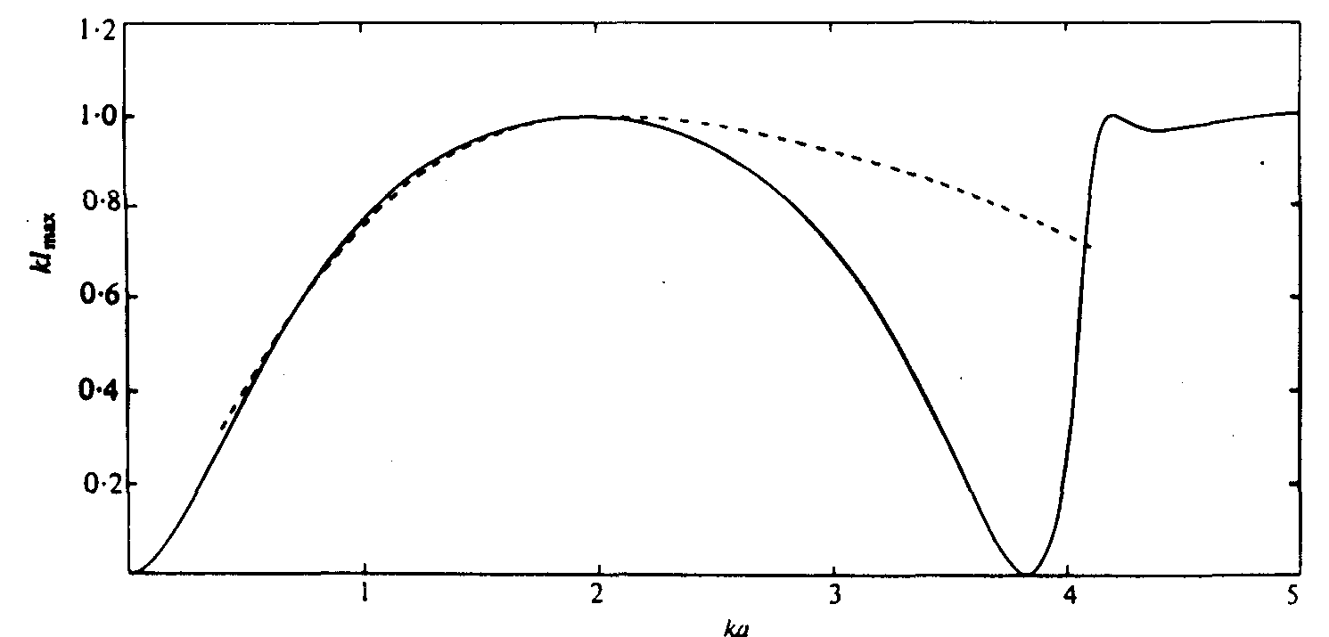 Рис. 4. Зміна klmax з безрозмірним хвильовим числом ka, для циркулярного поглинання коливальних поверхневих розподілів тиску (суцільна лінія) і циркулярного поглинання твердого диску (пунктирна лінія).