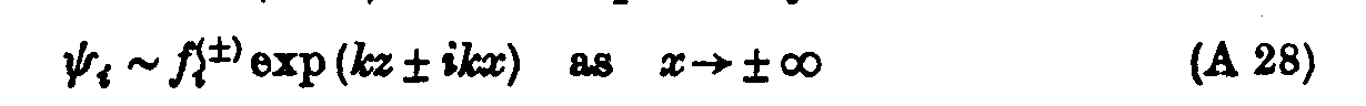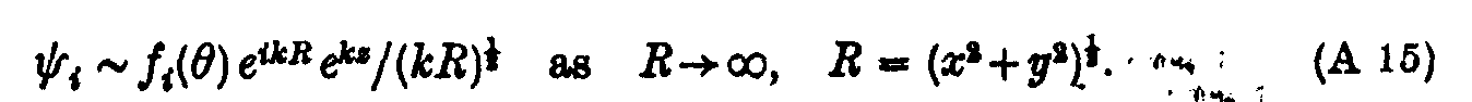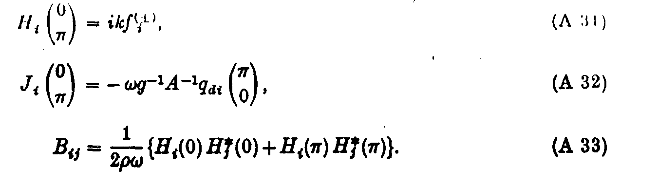 Показує, що цьому у двовимірній області також вимушений потік через Sі за допомогою набігаючої та дифрагованої області пропорційний амплітуді випромінюваного потенціалу в далекій області в напрямку, в якому прибуває набігаюча хвиля. В (А34) qdi – об’єм потоку в одиниці ширини поверхневого тиску. Подальші відношення між властивостями рішення і задачі потужності випромінювання та фd, рішенням дифракційної задачі в і дво- та тривимірних областях також можна отримати використанням функцій Коші та теореми Гріна. Зокрема, нові відношення, доведені Ньманом (1976), рівняння (48), (49)), переносяться на розподіли тиску без змін. Вони не подані тут, оскільки метод доведенняу ідентичний і вони не є необхідними в існуючому контексті.