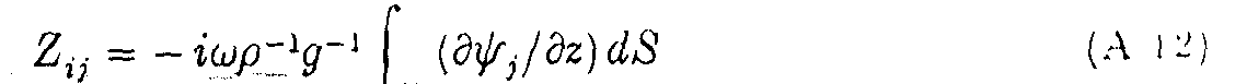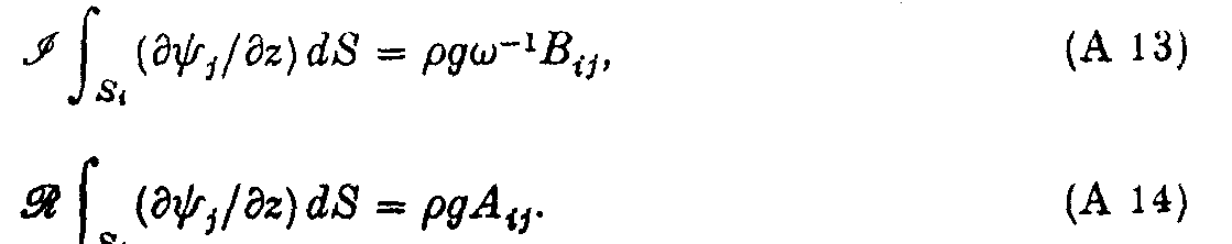 З цього випливає, що всі результати, які зв’язують властивості вимушеного руху твердого тіла в даному способі (Ньюман 1976), або ряд незалежно коливающихся твердих тіл (Срокоз 1979), відповідають задачі дифракційного розсіювання області набігаючої хвилі таким тілом або тілами, мають аналогію в поверхневих розподілах тиску. Відповідність буде, якщо тверді тіла прийняті як тонкі горизонтальні пластини, які роблять одиничні вертикальні коливання у вільній поверхні. Хоча вимагається, щоб к дорівнювало нулю в (А11) у цьому випадку, це не торкається результатів, які отримані за допомогою теореми Гріна. Відповідність завершується відзначенням, що вертикальна захоплююча сила на Sі, тільки iwpk-1qdi, тобто пропорційна об’єму потоку через Sі.