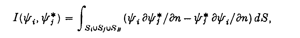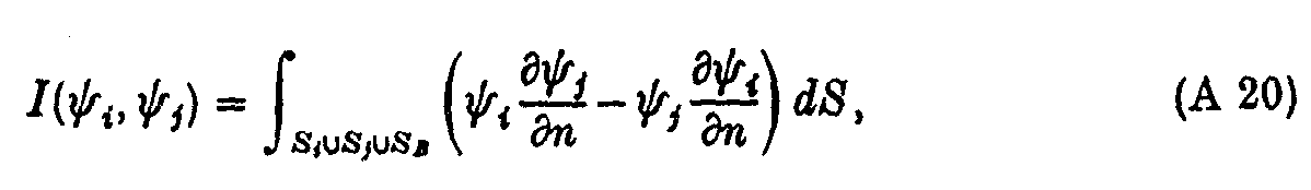 де інтегрування по і-й та j-й внутрішній вільній поверхні, а також по твердій границі SB. Тепер поверхня інтегрування (А20) може бути закрита більшим, вертикальним круглим циліндром Sc, який охоплює всі вільні поверхні та тверді границі і тягнеться від вільної поверхні вниз. Починаючи з і , j поведінка подібна убігаючій хвилі на більших відстанях, не дає додаткового внеску в (А20), отримується з інтегралу по Sc. Також, немає внеску від інтегралу по SF або по Sk, k = 1, ..., N, k і, k j. Отже з (А19) витікає, що: