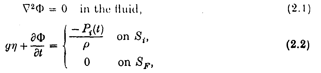 Попередні рішення пристроїв хвильової енергії, які базуються на ідеї форсування пійманого об’єму повітря на водній поверхні через турбіну, були змодельовані вільними поверхнями з умовою для твердої поверхні запропонованої вертикальної швидкості. Подивимось, наприклад, Коунта та ін. (1981). Там обговорювалось, що довгі хвилі принаймні (k 0), умова тиску (2.6) зводиться до умови твердої поверхні. Однак, щоб бути послідовними, те ж саме наближення потрібно зробити по вхідній вільній поверхні, в якій випадок задачі елемента хвилі втрачений.