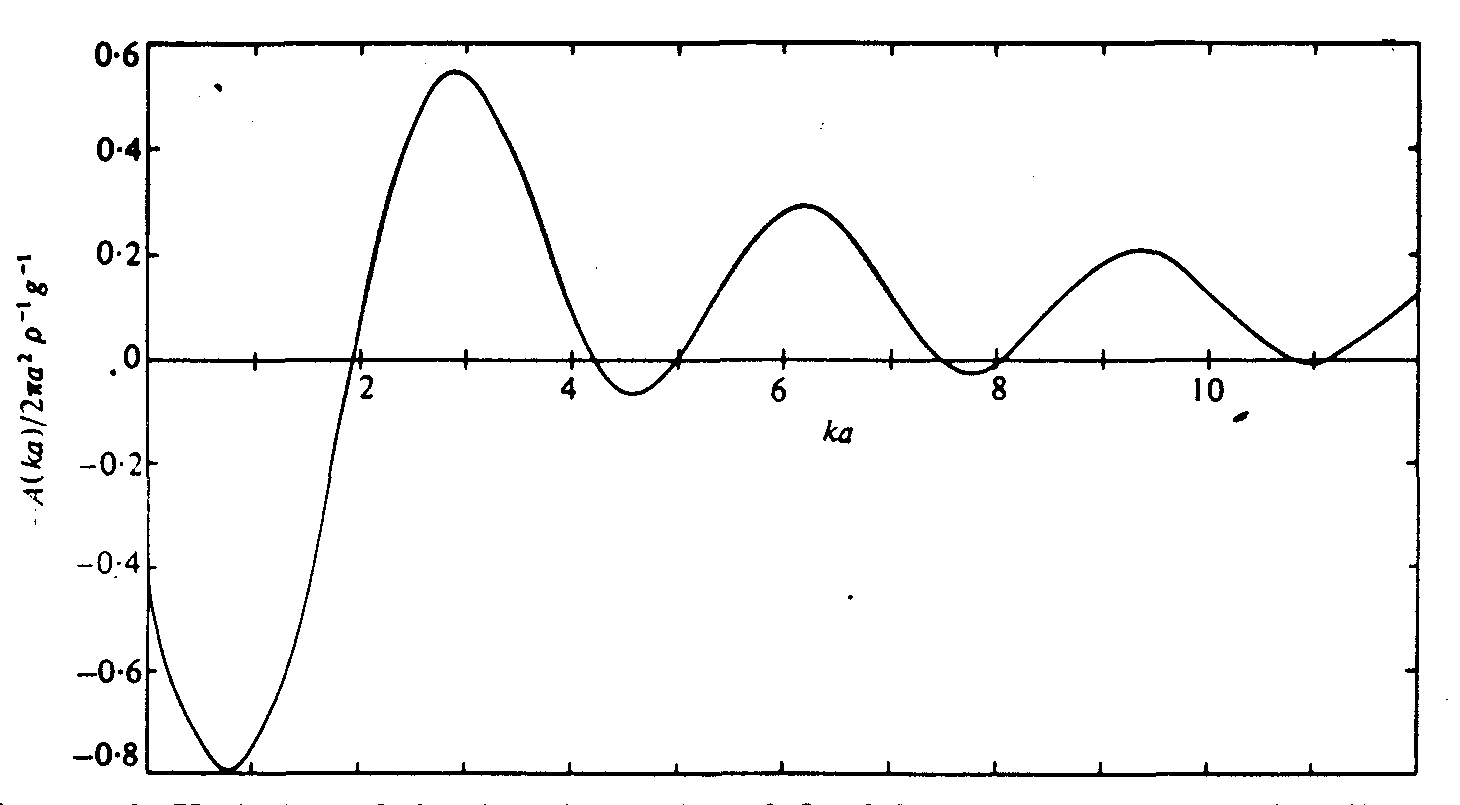 Рис. 3. Зміна функції А(ka), визначена рівнянням (3.10), з безрозмірним хвильовим числом ka, для круглого однорідного коливального поверхневого розподілу тиску радіусом a.