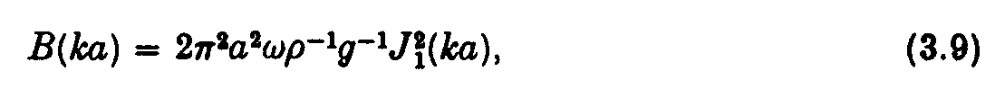 Граф виразу в фігурних дужках в (3.10) показаний на рис. 3 проти ka. Здається, що А(ka) має тільки сім нулів, перший з яких є ka = 1,96 відповідно до радіуса диску приблизно три десятки довжини хвилі. Перший нуль B (ka) відбувається в ka = 3,83.