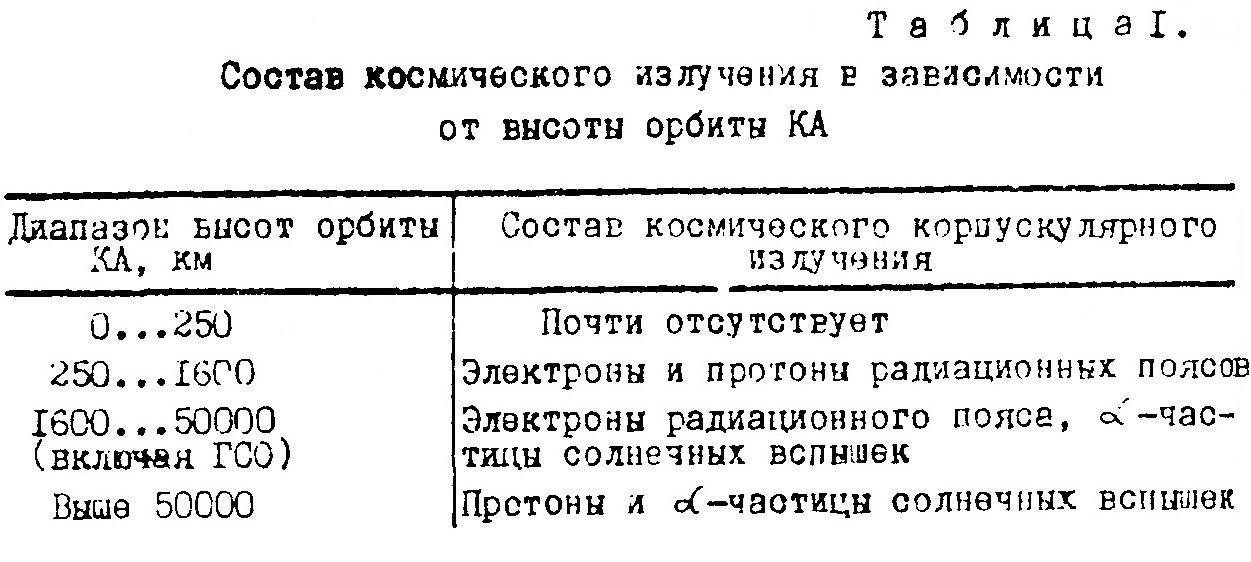 В 50-е годы в космическом пространстве установлено наличие потоков заряженных частиц (электронов, протонов, α-частиц), захваченных магнитным полем Земли. В таблице 1 указан состав космического корпускулярного излучения в зависимости от высоты полёта КА.