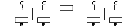 Предполагается, что можно рассматривать ячейку как систему последовательно соединенных конденсаторов, обкладки которых представляют собой проводящий слой диоксида олова, слой проводящих частиц с непроводящим слоем ПАВ, проводящую среду, обусловленную возникновением объемного заряда. Эквивалентная схема ячейки: