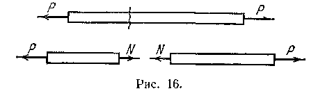 Если воспользоваться методом сечений, то становится очевидным, что во всех поперечных сечениях стержня возникают нормальные силы N, равные силе Р (рис. 16),