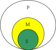 Третье понятие «планета», посредством которого устанавливается связь между большим и меньшим терминами, называется средним термином силлогизма и обозначается символом М (medium – посредник). Средний термин входит в каждую посылку, но не входит в заключение. Назначение среднего термина – быть связующим звеном между крайними терминами, между субъектом и предикатом вывода.