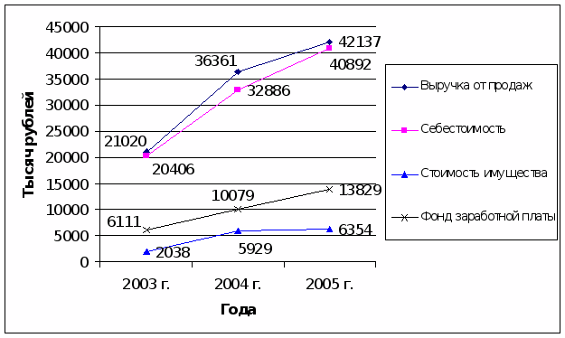 Чистая прибыль в 2005 г. возросла в 2,5 раза или на 850 тыс. руб., по сравнению с 2003 г. Стоимость имущества, за аналогичный период увеличилась на 4316 тыс. руб. или в 3,1 раза.