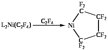 Т.о., взаимодействие сильного донора L>2>Pt (0) с сильным акцептором C>2>F>4> приводит к существенному переносу d-электронов на π-лиганд и образованию металлоцикла. Происходит окислительное присоединение π-лиганда к Pt(0) с образованием Pt(II) и аниона C>2>F>4>2-.