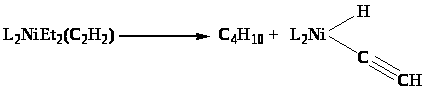 В π-комплексах II типа в первую очередь сильно разрыхляется тройная связь углерод-углерод и связь C-X при тройной связи. Так, активация связи С-Н в π-комплексах Ni(0), Pt(0), Os(0) или Rh(I) приводит к окислительному присоединению с образованием этинилгидридного комплекса металла: