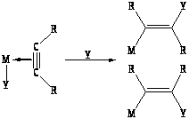 В ацетиленовых комплексах I типа (Ag(I), Cu(I), Hg(II), Pt(II), Pd(II), Ru(III) и др.) повышение электрофильности тройной связи приводит к облегчению взаимодействия с нуклеофильной частицей из раствора (транс-присоединение) или нуклеофилом, координированным металлом (цис-внедрение):