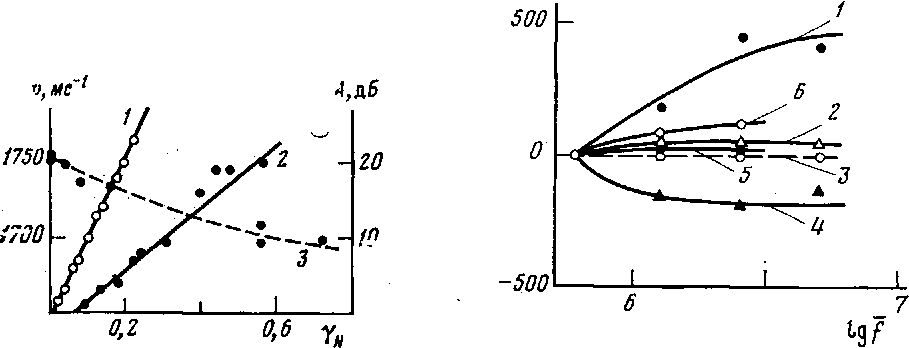 Упругое взаимодействие волны с поверхностями трещин и с поверхностями раздела связки и наполнителя должно приводить к зависимости фазовой скорости от частоты. На рис. 3 представлены экспериментальные результаты частотной зависимости изменения скорости Av—v,—v>2 >(у, и v>2>— скорости соответственно на частотах 0,5 и 5 МГц) в ПММА, граните, алюминии и в наполненном полимере.
