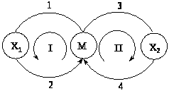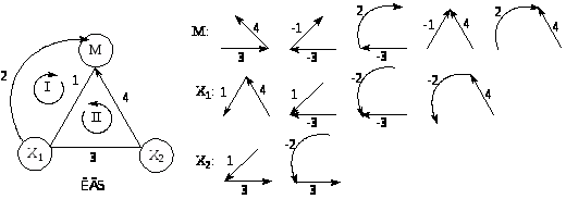 Деревом называется любая последовательность дуг графа, не содержащая циклов. Максимальным деревом (или каркасом) называют последовательность дуг, проходящую через все вершины и не содержащую циклов. Корневым деревом, или деревом, имеющим корень в вершине i (каркас вершины i), называют максимальное дерево, все дуги которого направлены к вершине i. Для КГ5 двухмаршрутной каталитической реакции приведены корневые деревья для вершин М, X1 и X2.