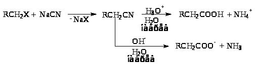 Нитрилы, получаемые из алкилгалогенидов и цианидов металлов по реакции нуклеофильного замещения, являются хорошими исходными продуктами для получения карбоновых кислот. Для этого их подвергают гидролизу в присутствии кислот или оснований: