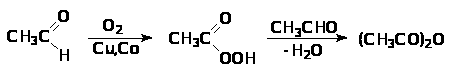 Уксусный ангидрид в промышленности получают окислением уксусного альдегида кислородом воздуха в присутствии медно-кобальтового катализатора: