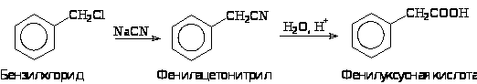 По этой схеме из доступного бензилхлорида получают фенилуксусную кислоту: