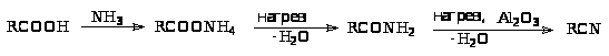 Дегидратация амидов, о которой мы говорили в предыдущем разделе может служить последней стадией в цепи превращений карбоновой кислоты в нитрил этой кислоты: