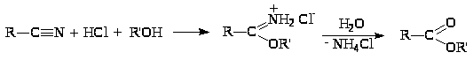 Действие на нитрилы хлороводорода в спирте приводит к образованию гидрохлоридов иминоэфиров, дальнейший гидролиз которых дает эфиры: