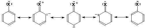 Свободные пары электронов на галогенах в них взаимодействуют с -системой связей бензольного кольца. Мезомерный эффект (+М-эффект) галогенов не велик, т.к. активность их р-электронов мала. Индуктивный же эффект (-I-эффект, т.е. оттяжка электронной пары связи к галогену) всегда велик, и он наводит положительный заряд на связанный с ним атом углерода и далее на о- и п-атомы углерода бензольного кольца.