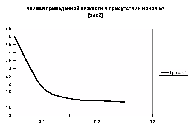На рис.2 представлена кривая приведенной вязкости сополимера ЭЭАКК/АК в присутствии ионов стронция. Из рисунка видно, что начальные значения вязкости чистого полимера имеют высокие значения. При добавлении незначительных количеств (0,5мл) соли стронция происходит резкое падение вязкости. Понижение приведенной вязкости вызывается связыванием ионов металла с полиэлектролитом, что в свою очередь уменьшает размеры цепи. Падение вязкости объясняется образованием компактных структур стабилизированных внутрицепными, межцепными «сшивками» существенно изменяющими гидродинамические размеры макромолекулы, где роль сшивающего агента играют ионы металла.