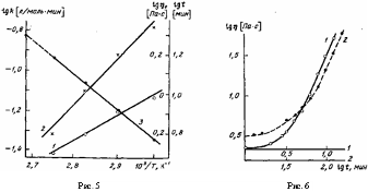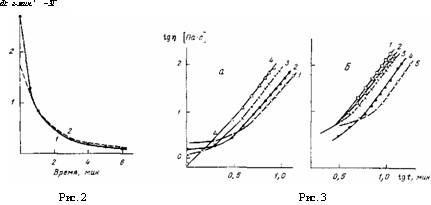 Характерно, что точка расхождения экспериментальной и расчетной кривых на рис. 2 совпадает с точкой перелома на рис. 1, б. Полученные результаты, т. е. изменение наклона прямой на рис. 1, б и расхождение кривых на рис. 2, свидетельствуют о том, что в рассматриваемом случае изменяется характер процесса, отражающийся на его кинетике. Попытаемся понять причину этого явления с помощью реокинетического анализа.