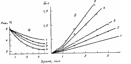 Увеличение вязкости на начальных стадиях отверждения ПУ может быть обусловлено удлинением макромолекулярных цепей вследствие протекания процесса линейной конденсации, поскольку используемые олиго-меры представляют собой бифункциональные соединения. В этом случае скорость роста макромолекулярных цепей отражается кинетикой уменьшения концентрации концевых функциональных групп. Изменение концентрации концевых NCO-групп до образования визуально наблюдаемой в растворе нерастворимой фракции показано на рис. 1, а. Кинетика процесса поликонденсации двух бифункциональных мономеров при их экви-мольном соотношении обычно описывается уравнением второго порядка по концентрации функциональных групп, интегрирование которого дает следующее известное выражение для среднечисленной степени поликонденсации образующего полимера: N—l=Xokt, где N — степень поликонденсации; Хо — начальная концентрация функциональных групп; к — константа скорости реакции; t — время.