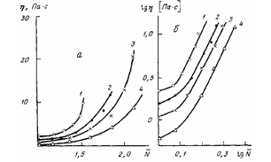 Рассмотрим также температурную зависимость вязкости на различных стадиях процесса поликонденсации, что важно, поскольку эта зависимость включает формальные реологические константы материала.