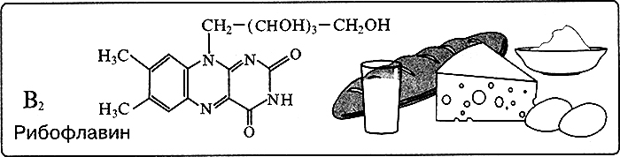 Витамин В>2>, рибофлавин (Riboflavinum) регулирует уровень сахара и азота в организме. Он входит в состав ферментов, ускоряющих окислительно-восстановительные процессы и тесно связанных с клеточным дыханием. Витамин В>2> улучшает обмен веществ и нормализует функциональную деятельность центральной нервной системы, кровеносных капилляров, секреторных желез желудка и кишечника, печени, кожи и слизистых оболочек, необходим для синтеза белка и жира. Суточная потребность в нём составляет 2-3 мг.
