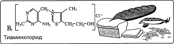 Витамин В>1> способствует росту организма, а также нормализации перистальтики желудка и кислотности желудочного сока. Его недостаток сопровождается расстройством жизнедеятельности организма, бессонницей, раздражительностью, в тяжёлых случаях параличом нижних конечностей. Суточная потребность взрослого – 2 мг. Источником витамина В>1> являются: хлеб из муки грубого помола, крупы, мясо, орехи. Особенно много витамина В>1> в зародышах и оболочках пшеницы, овса, гречихи, в пивных дрожжах, зелёном горошке.