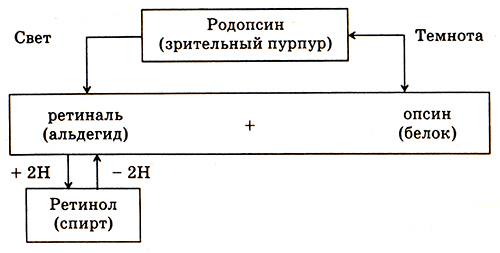 Участие ретинола в процессе зрения заключается в том, что содержащееся в сетчатке глаза комплексное соединение – родопсин, или зрительный пурпур, распадается на составные части: белок (опсин) и альдегид (ретиналь), который восстанавливается в ретинол: