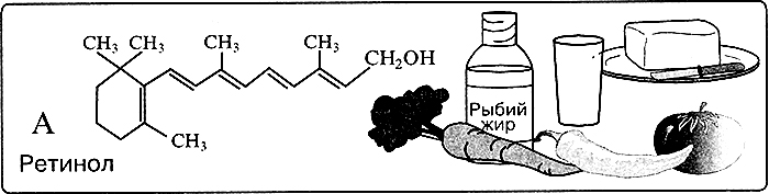 При его недостатке ухудшается зрение (ксерофтальмия – сухость роговых оболочек; «куриная слепота»), замедляется рост молодого организма, особенно костей, наблюдается повреждение слизистых оболочек дыхательных путей, пищеварительной системы. Обнаружен только в продуктах животного происхождения, особенно много его в печени морских животных и рыб. В рыбьем жире – 15 мг%, печени трески – 4; сливочном масле – 0,5; молоке – 0,025. Потребность человека в витамине А может быть удовлетворена и за счёт растительной пищи, в которой содержатся его провитамины – каротины. Из молекулы β-каротина образуются две молекулы витамина А. β-Каротина больше всего в моркови – 9,0 мг%, красном перце – 2, помидорах – 1, сливочном масле – 0,2-0,4 мг%. Витамин А разрушается под действием света, кислорода воздуха, при термической обработке (до 30%).