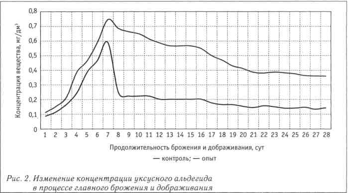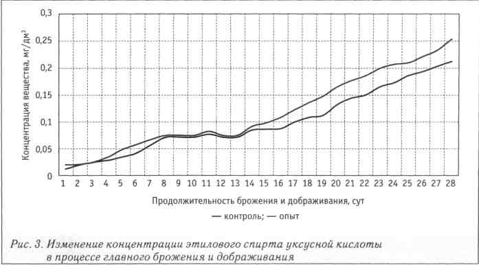 В процессе главного брожения повышается концентрация всех летучих компонентов. В опытном образце с содержанием кислорода в сусле 40-45 мг 02/дм3 до задачи дрожжей отмечаются более высокие значения ацетальдегида, высших спиртов и этилового эфира уксусной кислоты по сравнению с контролем.