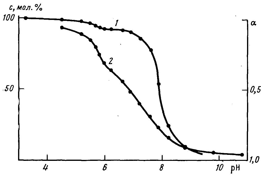 Рис. 2. Зависимость количества ионизованных молекул порфина с и степени ионизации а ПМАК (2) от рН раствора