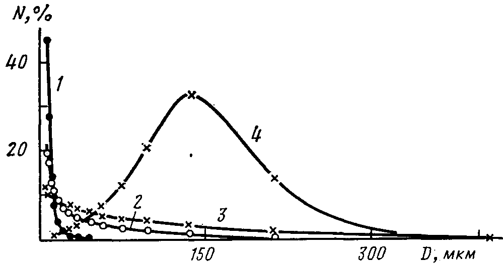Рис. 1. Влияние степени покрытия частиц каолина Глуховецкого месторождения ПЭ на дифференциальные кривые числового распределения частиц N по эквивалентному диаметру D. Покрытие частиц каолина ПЭ, %: 0 (1); 3,8 (2); 9,1 (3) и 19,1% (4)