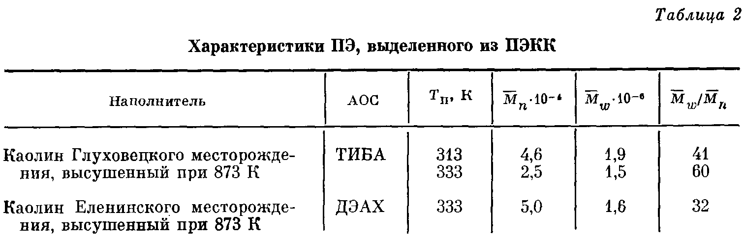 Известно [8,10], что агрегирование и диспергируемость — сложные функции химического состава наполнителя. Полученные результаты дают основание предположить, что диспергирование частиц боксита, являющегося полиминеральной породой, под действием АОС происходит в меньшей степени, чем каолина, вследствие чего полимеризация этилена частично идет на исходных агломератах боксита.
