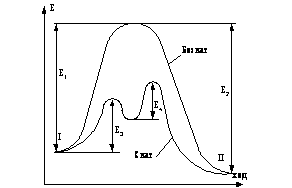 4) Катализатор не изменяет величины константы равновесия ∆H,∆S, ∆U, ∆F. Это означает, что равновесие, выход в присутствии катализатора остаётся тем же самым. Катализатор изменяет кинетические характеристики р-ии (EАКТ и предэкспоненты PZ0). действие катализатора может быть объяснено энергией активации процесса. Е3 и Е4 – энергии активации при образовании промежуточных соединений (а) и при его распаде (б), вследствие того, что энергия активации Е1 заменяет меньшую энергию Е3 и Е4 2-ух последних стадий скорость р-ии возрастает, даже если Е3+ Е4.>Е1 CH3CHO→CH4+CO при t=518ºC ЕАКТ=45.5 ккал/моль в присутствии паров J2 энергия активации снижается до ЕАКТ=32,5 ккал/моль. Скорость возрастает в 10000 раз. Катализатор ускоряет и прямую и обратную р-ии в равной мере, при этом константа равновесия не изменяется. А время достижения системой равновесного состояния уменьшается.