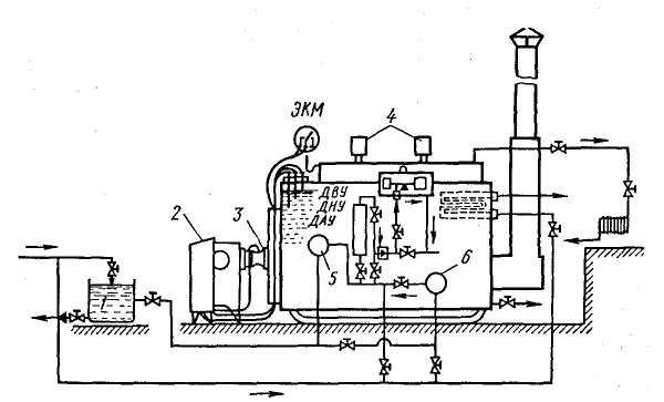 / — резервный бак для воды, 2 — пульт управления, 3 — регулирующий вентиль горелки, 4 — предохранительные клапаны, 5 — ручной насос, 6 — электронасос, ЖМ — электрокон-такгный манометр, ДВУ, ДНУ и ДАУ—соответственно датчик верхнего, нижнего и аварийного уровней