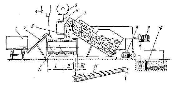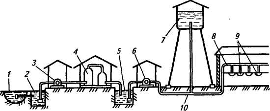 / — источник воды; 2 — водозаборное сооружение; 3 — насосная станция первого подъема воды; 4— очистное сооружение; 5— резервуар для чистой воды; 6— насосная станция второго подъема; 7—напорное сооружение; 8— внутренний водопровод; 9 — водораздаточные устройства; 10— внешний водопровод