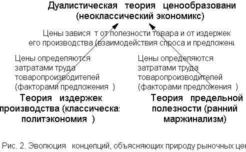 «Старая» неоклассика. В основе всех теорий, анализирующих рыночное хозяйство, лежит какая-либо концепция, объясняющая принципы ценообразования. Неоклассическая концепция сформировалась в результате синтеза разрабатываемой представителями классической политэкономии трудовой теории стоимости и маржиналистской теории предельной полезности (рис. 2).