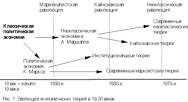 Во 2-ой половине 19 в. путь развития экономических идей раздвоился (рис. 1). Анализом социальных проблем экономики занимались в основном последователи марксистской политической экономии (с 20 в. – также и институционализма). Изучение же собственно механизма функционирования рыночного хозяйства стало прерогативой сторонников неоклассической экономической теории (неоклассики). Оба эти направления вышли из классической политэкономии, но если сторонники первого направления подвергли критическому пересмотру принципы рационального эгоизма и «невидимой руки» рынка, то сторонники второго, напротив, продолжали считать их основой подлинно научного анализа.