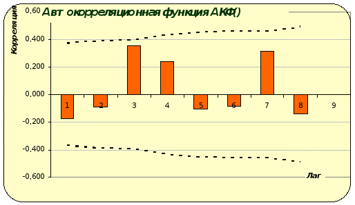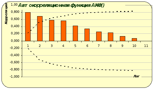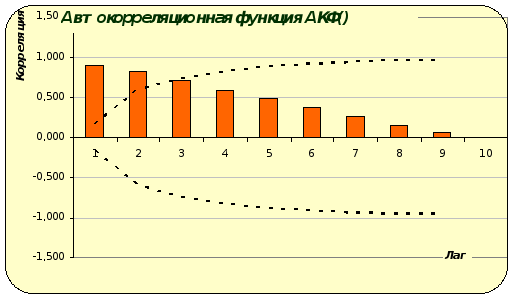 Периодические составляющие временного ряда могут быть найдены с помощью коррелограммы. Коррелограмма (автокоррелограмма) показывает численно и графически автокорреляционную функцию (AКФ), иными словами коэффициенты автокорреляции для последовательности лагов из определенного диапазона. На коррелограмме обычно отмечается диапазон в размере двух стандартных ошибок на каждом лаге, однако обычно величина автокорреляции более интересна, чем ее надежность, потому что интерес в основном представляют очень сильные1 автокорреляции [6, 207].